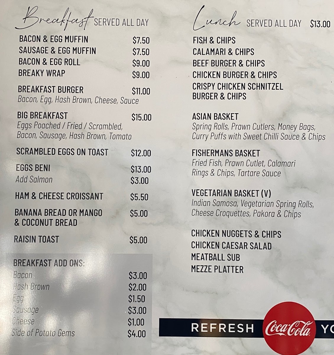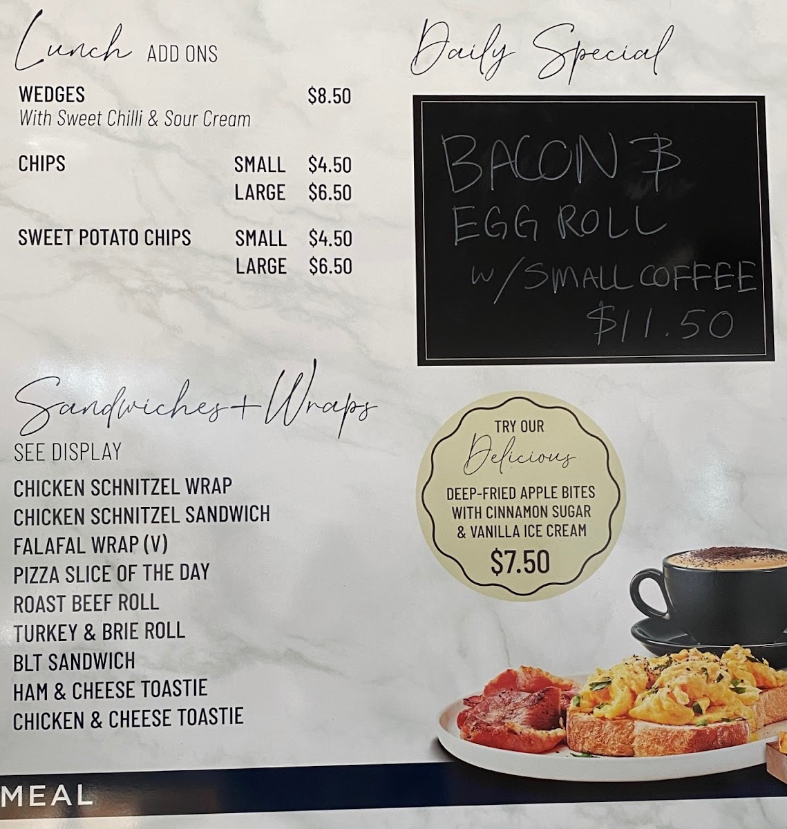 - Sandwiches and Wraps: A variety of sandwiches and wraps are available, including chicken schnitzel wraps and sandwiches, falafel wraps, roast beef rolls, turkey and brie rolls, BLT sandwiches, ham and cheese toasties, and chicken and cheese toasties.